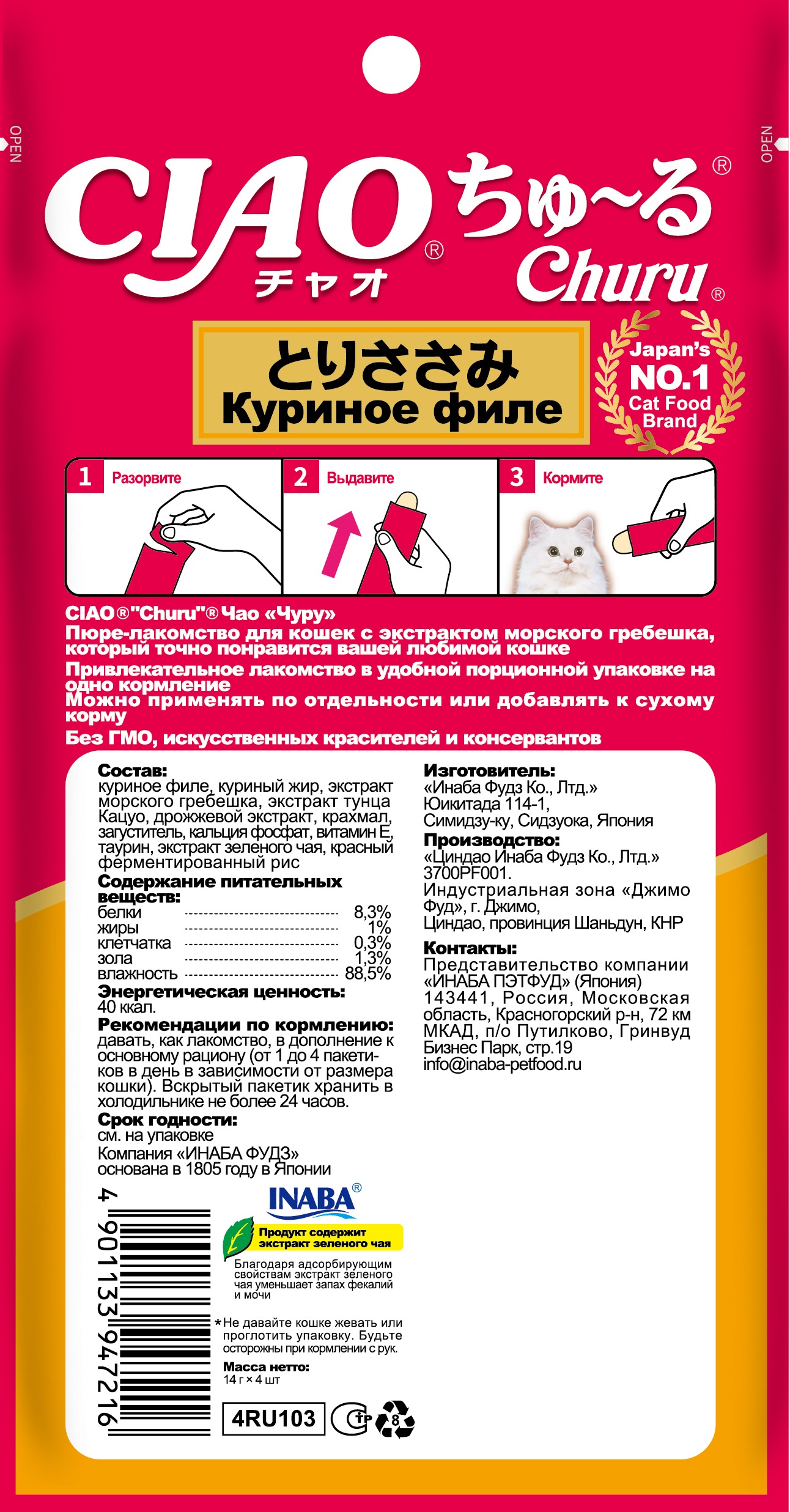 Состав: куриное филе, куриный жир, экстракт морского гребешка, экстракт тунца Кацуо, дрожжевой экстракт, крахмал, загуститель, кальция фосфат, витамин Е, таурин, экстракт зеленого чая, красный ферментированный рис
