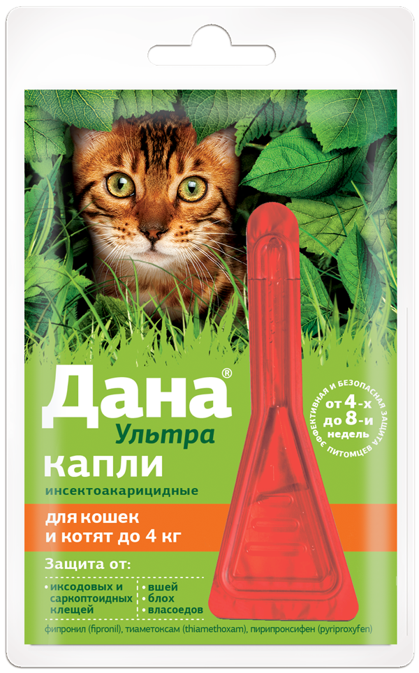 Капли Дана Ультра применяют собакам и кошкам с 10-недельного возраста для лечения и профилактики энтомозов, вызываемых блохами, вшами, власоедами; акарозов, вызываемых саркоптоидными и иксодовыми клещами.