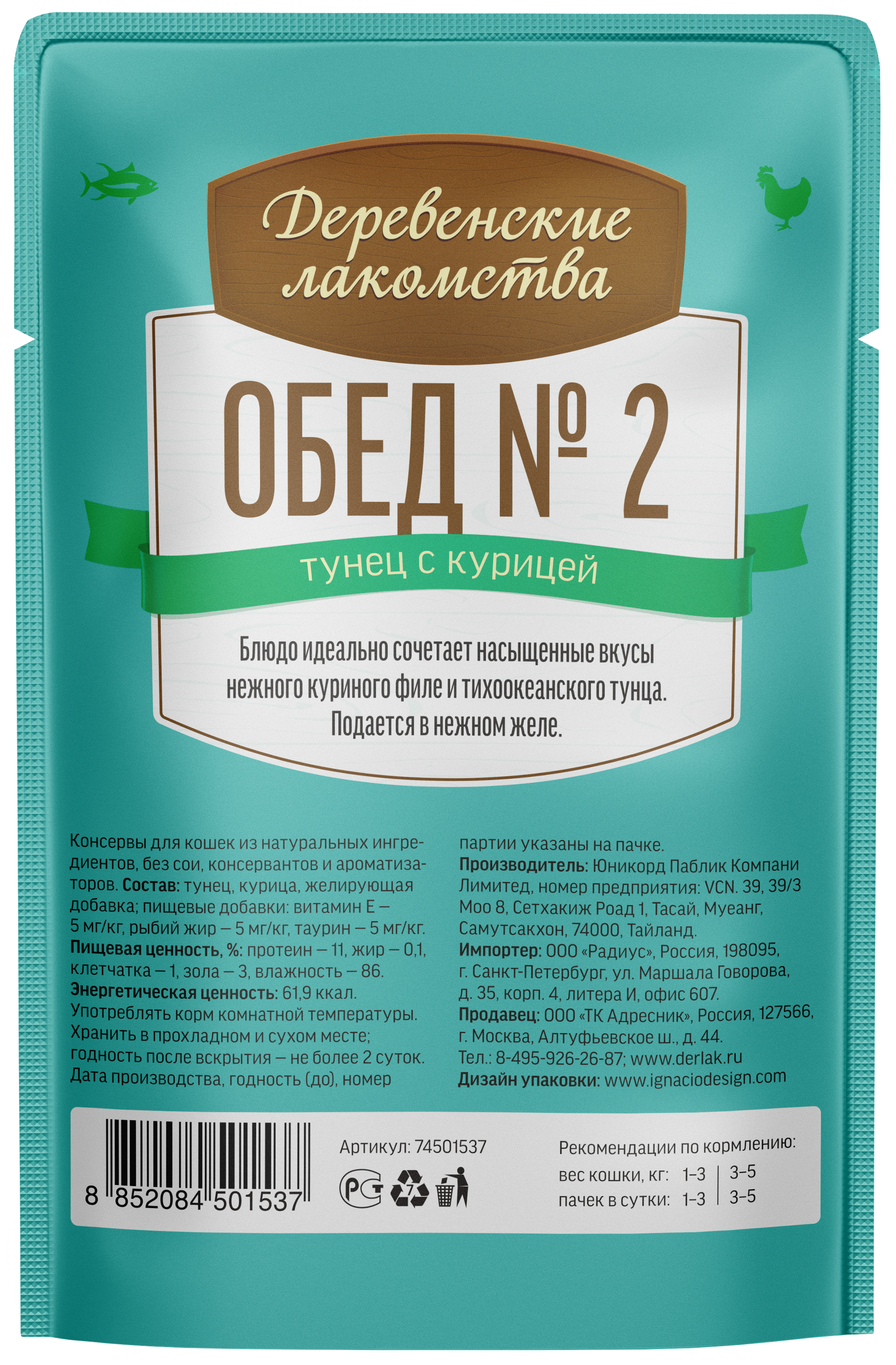 Деревенские лакомства Обед №2 влажный корм для кошек, тунец с курицей в нежном желе (12шт в уп)