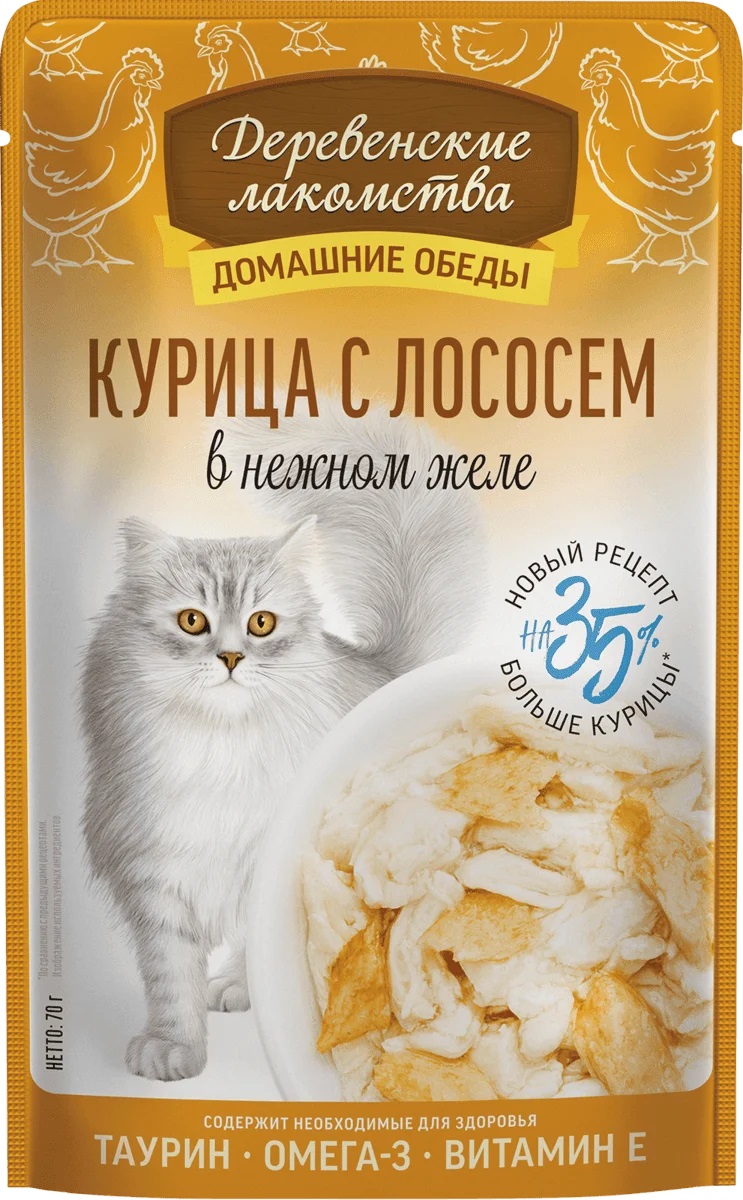 Консервированный влажный корм для кошек серии «Деревенские лакомства — Домашние обеды» — сочетание нежного мяса курицы с благородным лососем. Этот дуэт создает уникальный вкусовой букет и восхитительный аромат, способный удовлетворить запросы даже самых привередливых питомцев. Легкое, воздушное желе придает блюду неповторимую текстуру и дополнительную сочность.