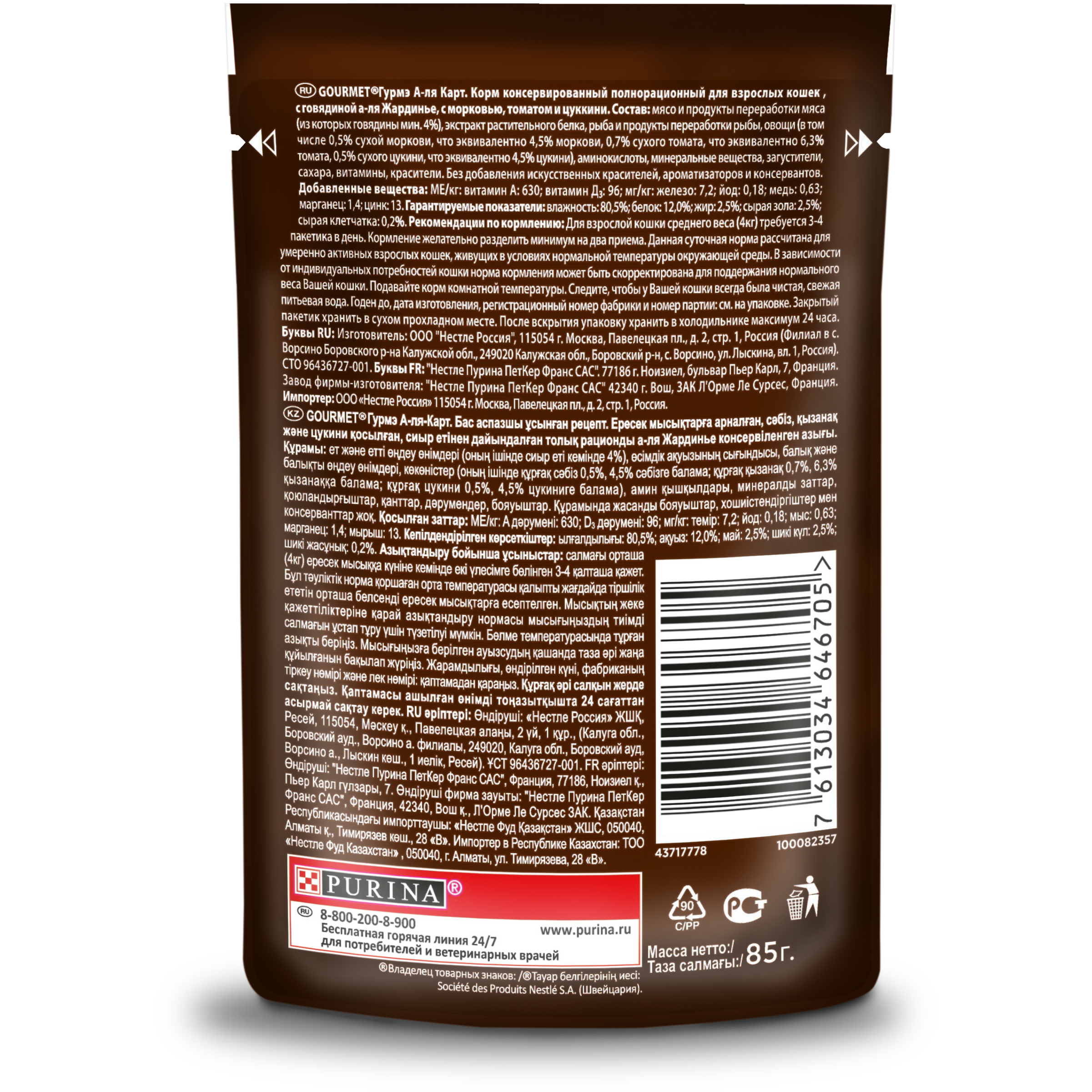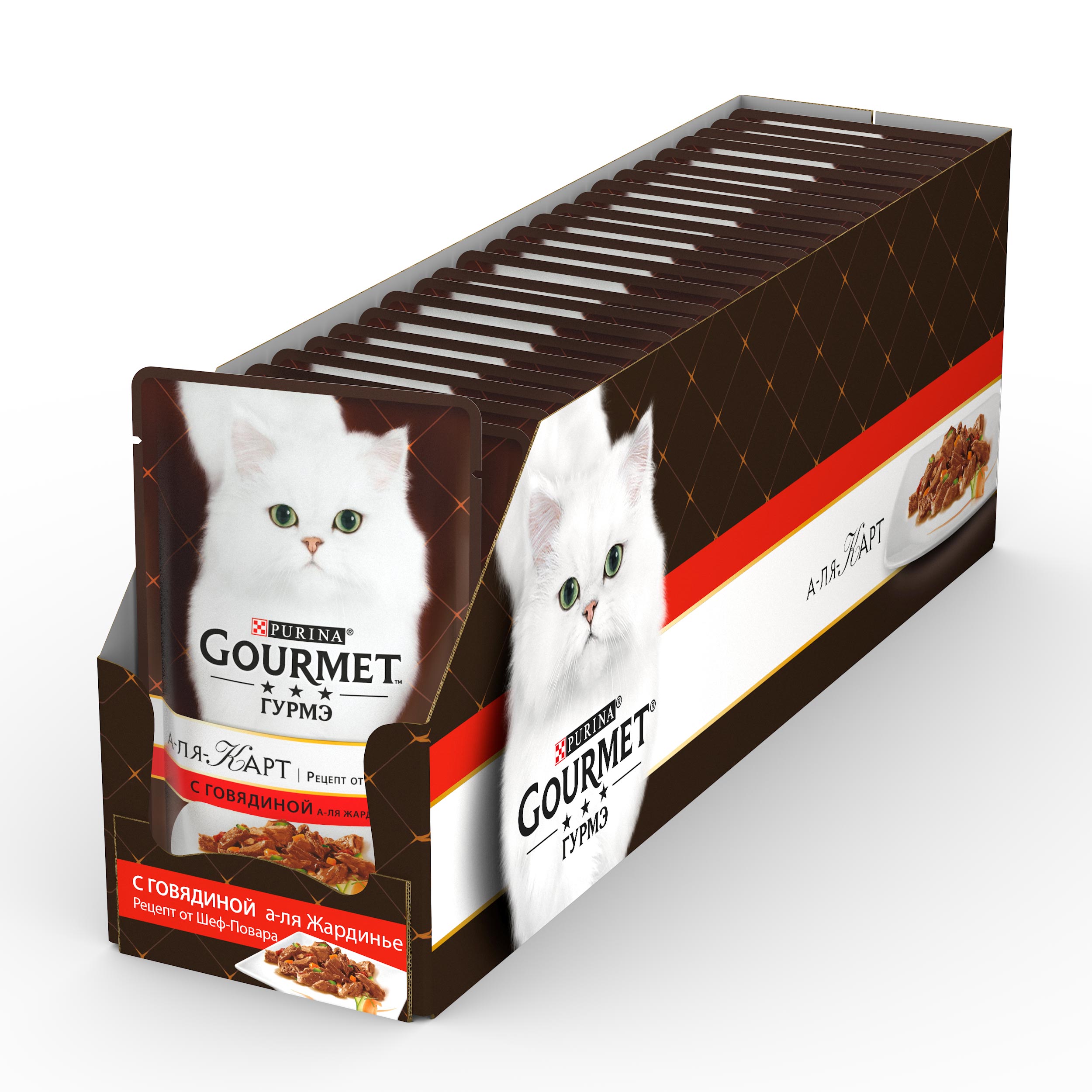 Корм для взрослых питомцев «Гурмэ А-ля Карт» — это изысканное сочетание бережно приготовленного мясного ассорти с тщательно подобранным разнообразным ароматным гарниром. Корм для кошек от Gourmet полнорационный, содержит все необходимые для здоровья микронутриенты. Влажный корм с богатой вкусовой палитрой не оставит равнодушным Вашего пушистого гурмана.
